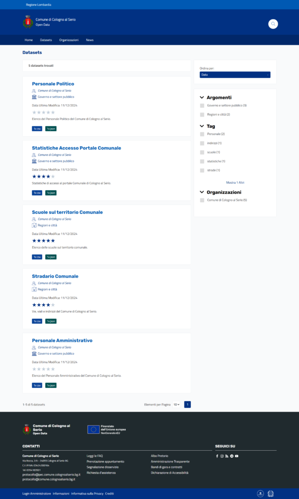 Il nostro portale Open Data, sviluppato seguendo le linee guida ministeriali, utilizza il CMS Drupal per semplificare la gestione dei contenuti e dei dataset. La struttura del portale è suddivisa in sezioni e categorie di dataset definite dal Ministero. Ogni dataset può essere arricchito con tag personalizzati, consentendo agli utenti di filtrare i risultati in modo rapido e intuitivo.